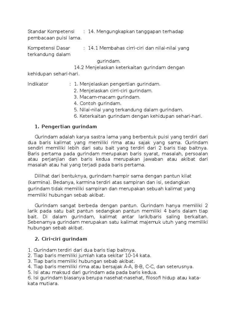 10 Contoh Gurindam Syair Dan Pantun Cikimm Com from imgv2-2-f.scribdassets.com Bagaimana ciri dan contoh gurindam? Gurindam bebas merupakan gurindam yang tidak terikat aturan barisnya. Gurindam mungkin terdengar asing bagi sebagian orang. Gurindam hanya terdiri dari dua baris, tidak ada lagi di setiap bait. Gurindam adalah bagian dari kekayaan sastra. Gurindam berisi nasehat atau filosofi hidup. Untuk itu, mari kita simak berikut ini! Terdiri dari dua baris, jumlah kata perbaris hanya sekitar 10 kata saja.